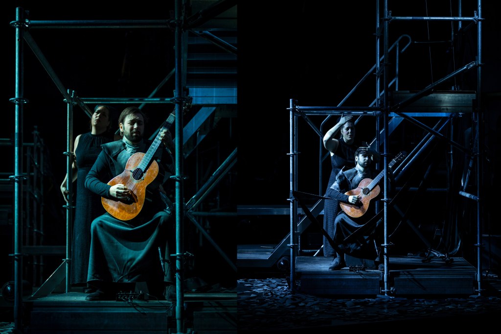 The story we tell on stage against Djuro Zivkovic’s musicalization of St. Symeon’s Hymns of Divine Eros may be the narrative of a community facing the challenges of destruction, mourning, and rebuilding through the power of introspection and ritual; or perhaps the drama of three characters, a Guardian (singer), a Wounded Visitor (guitarist), and a Youth (dancer), whose trajectories briefly intersect.