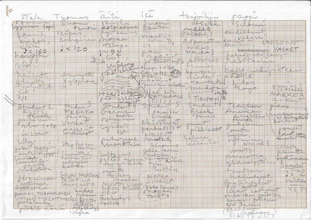 Tout commence en 2012 avec une commande du Royal Opera House de Covent Garden. Cette maison lançait alors un vaste programme de commandes, consistant à proposer à plusieurs compositeurs de répondre par un opéra à une série de questions très générales qui étaient : « Qu’est-ce qui nous préoccupe aujourd’hui ? Comment nous mettons-nous en représentation sur la scène ? Quels sont les mythes collectifs de notre présent et de notre futur ? » Kaija Saariaho a vu dans ces questions une opportunité de faire quelque chose dont elle n’était pas coutumière : montrer dans sa musique une réalité proche et contemporaine. Le projet s’est d’autant plus radicalisé dans cette direction parce que Kaija était alors en train de préparer un autre opéra, qui allait devenir Only the Sound Remains (créé en 2016). C’est là une œuvre qui est inspirée des traductions de deux pièces de théâtre nô, ce qui se traduit dans un dispositif très resserré : deux personnages, un orchestre de chambre et un chœur de chambre. Kaija, au moment où on lui propose en 2012 d’imaginer un autre opéra en plus de celui sur lequel elle a déjà commencé à travailler, imagine en quelque sorte un projet complémentaire. Only the Sound Remains a une origine ancienne et lointaine, le théâtre japonais du 15e siècle ; il faudra donc au contraire aller au plus contemporain et au plus proche. Only the Sound Remains présente, comme tous les opéras précédents de Kaija, une concentration de l’action sur une poignée de personnages ; il faudra donc au contraire explorer une multiplication du nombre de personnages, de leurs caractères musicaux et même de leurs langues d’expression. Voici un document qui illustre très bien comment ces deux projets se sont développés en miroir l’un de l’autre : c’est une double page du carnet de notes de Kaija qui date de cette époque.