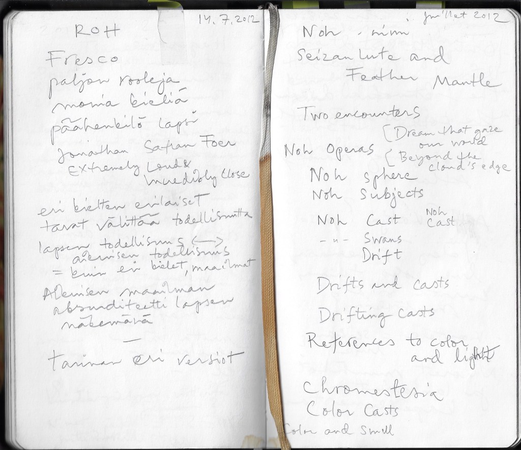 À droite vous voyez des pistes de réflexion sur le titre à donner à un « Noh opera » qui sera Only the Sound Remains, et à gauche des idées pour le projet marqué « ROH », c’est-à-dire Royal Opera House. On y voit plusieurs idées dont la compositrice s’éloignera, mais aussi les idées principales qu’elle a choisi d’explorer, notamment celle d’une fresque(fresco) et celle d’une œuvre en plusieurs langues (monia kieliä) dans laquelle se diffractent plusieurs versions d’une même histoire (tarinan eri versiot).