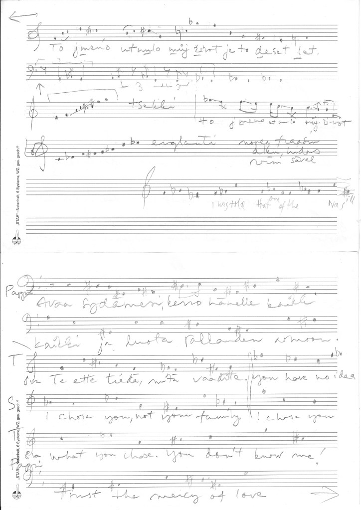 On voit par exemple ici du texte en tchèque. Kaija Saariaho, qui donc ne parle pas un mot de tchèque, a noté ce qu’elle entendait dans l’enregistrement, et étudié à quoi correspond chaque mot, pour en tirer une musique qui est spécifique à la fois à la langue tchèque et au personnage qui l’utilise (l’emploi du tchèque était d’ailleurs entre nous un hommage rendu au compositeur Leoš Janáček qui procédait de la même manière). Vous verrez que cette même méthode a été appliquée à chaque personnage – il y a treize personnages dans l’opéra, ce qui est au passage le seul détail formel que nous avons gardé de la fresque de Léonard de Vinci. Enfin ce matériau musical, Kaija l’a utilisé comme base pour l’ensemble de la musique de l’opéra : vous entendrez donc que chaque personnage est très reconnaissable, et que parfois sa présence se fait sentir dans la musique de l’orchestre même lorsqu’il est absent. On peut dire que l’ensemble du processus de composition d’Innocence a consisté à inventer un univers musical dans lequel ces différentes langues coexistent et collaborent, et forment un tissu coloré au maillage subtil. Tout se traduit dans tous les sens, c’est un opéra né de la traduction comme mouvement, transposition infinie, recherche d’une voix dans le texte, de moi à l’autre à moi, mot à mot et note à note. C’est là son affinité secrète avec Only the Sound Remains, l’opéra faux-jumeau, né de la tentative de traduire le japonais en anglais (dans une chaîne de transmission singulière que j’évoque ailleurs). Sauf que là où Only the Sound Remains parle de la difficulté de traduire pour opérer la rencontre des cultures et des individus, Innocence donne à voir un monde déjà mélangé tout entier fait de traduction.