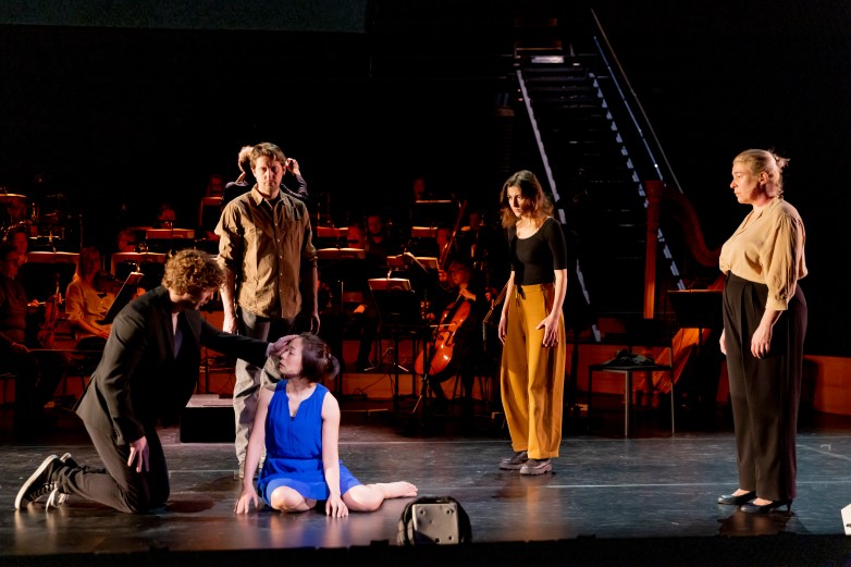 This was embodied in particular by the versatility of Koskinen’s use of the orchestra, a band of 16 players (later expanded with more strings) which was in our production set center-stage, with all the elements of the set built around it, as the central piece of a machine. The orchestral prelude paints a broad landscape, with minimal resources stretched to grandiose scales: two notes hammered on the piano with the support of loud string harmonics, alternating with pointillistic gestures from the winds, the harp and the percussion, are enough to weave what turns out to be shimmering textures, effortlessly and organically opening and closing gaps that are filled by the solo viola and, eventually, the speaking voice, which unfolds at natural volume over atmospheric held string notes. Within a couple of minutes, the nature of this music is made crystal clear: it will without a build-up unleash its power and dominate the space, and then in the blink of an eye bend and serve the text, only to suddenly assume control over time again. Ophelia’s heart, says Müller’s text spoken by the orchestra, “is a clock”, and the character moves physically and aurally in an environment that will grind her alive if given the occasion, even and especially as it forces her to dance. In the scenes of dialogue, the repetition of short rhythmical noises and melodic motives gives the impression of a nightmarish clockwork – not manmade but of elemental proportions – inside which the solo viola oddly enough manages to breathe at its own pace. The orchestra seems to break apart when it is comically used as individual instruments characterizing different characters or as a ‘stage band’, but acting as the relentless chorus or rebuilding into a larger mass it always returns to its role of the hostile crowd. Only the viola cadenza seems to tame and harness it towards the end of the piece, like the dream of a successful revolution, achieved in cantabile softness, leading to Ophelia (turned Elektra by Müller) finally taking control over the machine for her last monologue, merging with it harmonically, and turning the threat against us, her oppressors. In this last movement – the ‘Abyss’ (Tiefsee) that gives its name to the work – the whole clockwork, with its unpredictable, shrill outbursts of violence, seems to have sunk underwater and to bubble and sigh, together with the invisible life of its new oceanic environment.
