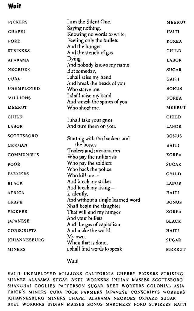 POÈME, MONTAGE, DISPOSITIF. Quand elle ne s’oublie pas dans l’épanchement et la contemplation d’elle-même et du moi, dans certains moments de condensation exceptionnelle, la poésie est capable, comme art du montage sauvage et du dispositif textuel, de donner à voir quelque chose de la position infra-historique qui semblerait réclamer la lourdeur des moyens du roman. Il a fallu à Anna Akhmatova, en sus d’une tragédie intimement vécu, l’acméisme, c’est-à-dire le dépassement simultané du symbolisme et du naturalisme dans une phénoménologie franche des choses et des mots, pour donner secrètement les tableaux en bordure d’histoire qui composent son Requiem (1935-1940) et faire ainsi chanter en vers les vies détruites par la répression staliniste, dans les files d’attente des prisons soviétiques dont elle offre plus qu’un témoignage : « Et je ne prie pas pour moi seule, / Mais pour toutes celles qui, avec moi, se tenaient ici… » (trad. Sophie Benech). Il a fallu à Langston Hughes le mélange de bien des langues et bien des façons de chanter et, là encore, la violence d’une société profondément vécue dans la chair, pour proposer dans les années 1930 un poème aussi singulier que « Wait », qui est peut-être le poème même de l’infra-historique comme dialectique supra-historique :